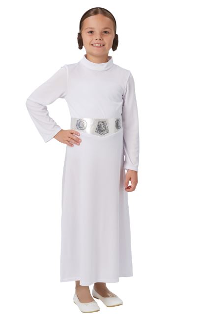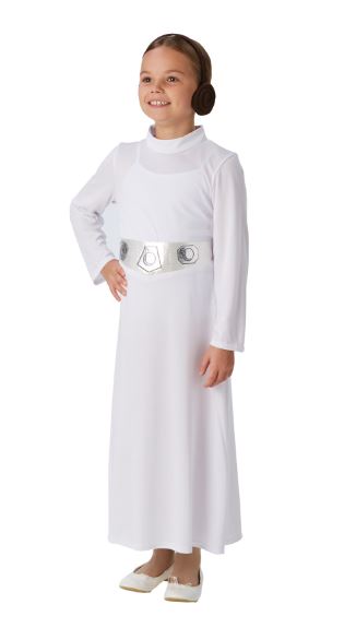 This Tween Princess Leia costume includes a long white dress with an attached silver belt. To complete the look a headband is also included.
