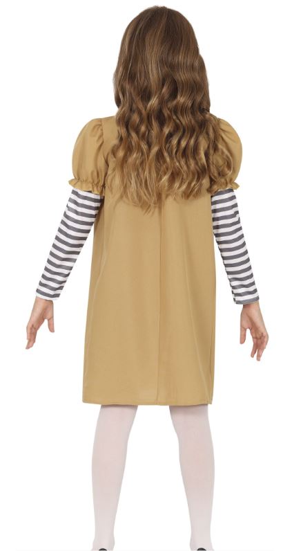Tween psycho doll costume, inspired by M3GAN movie, creepy doll look, tan dress with striped sleeves, red bow detail, soft and comfy fabric, easy to wear, perfect for Halloween, horror cosplay, dress-up parties, spooky style, doll-like appearance
