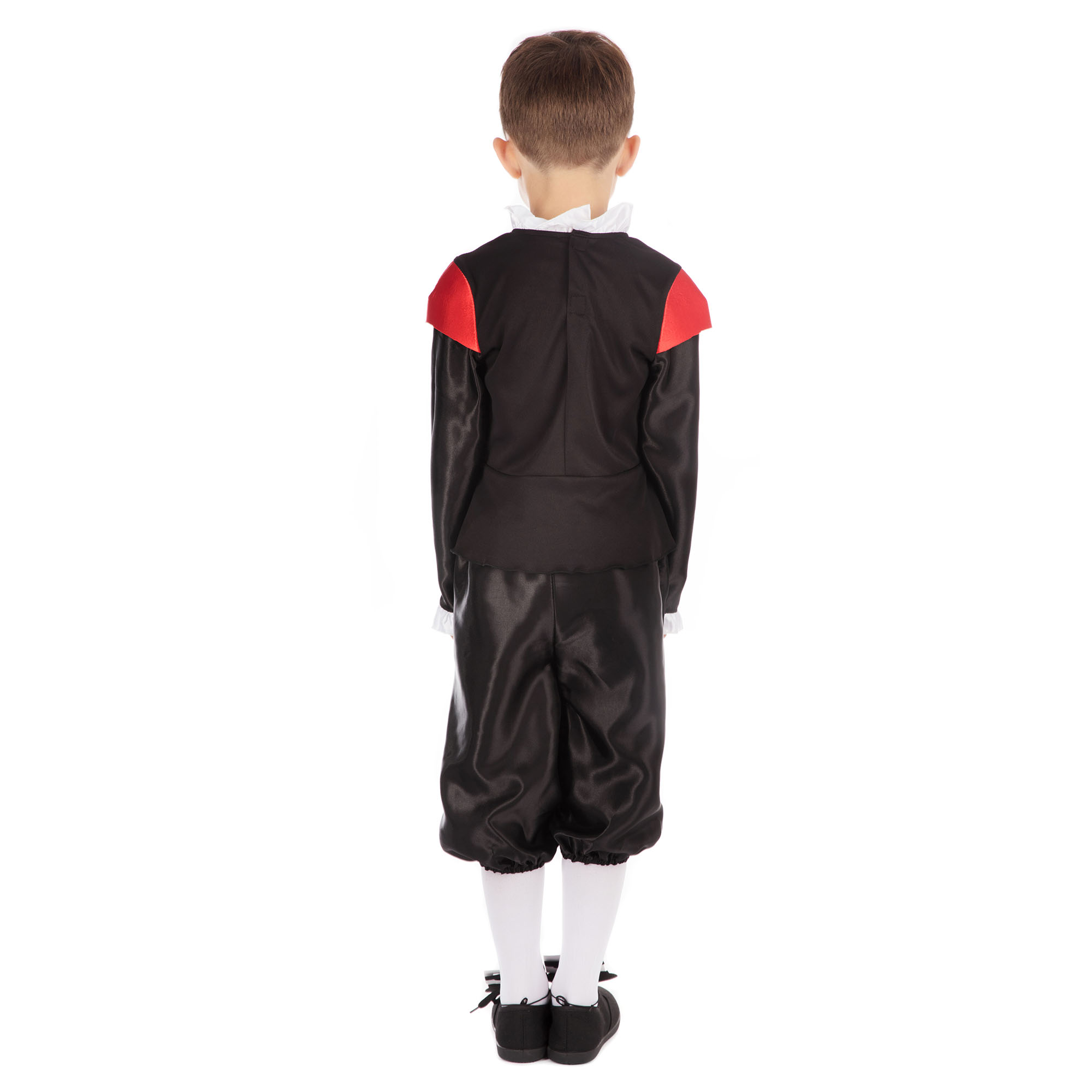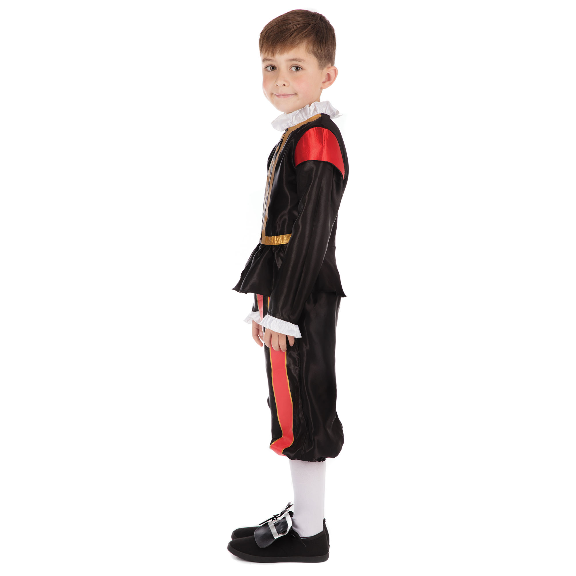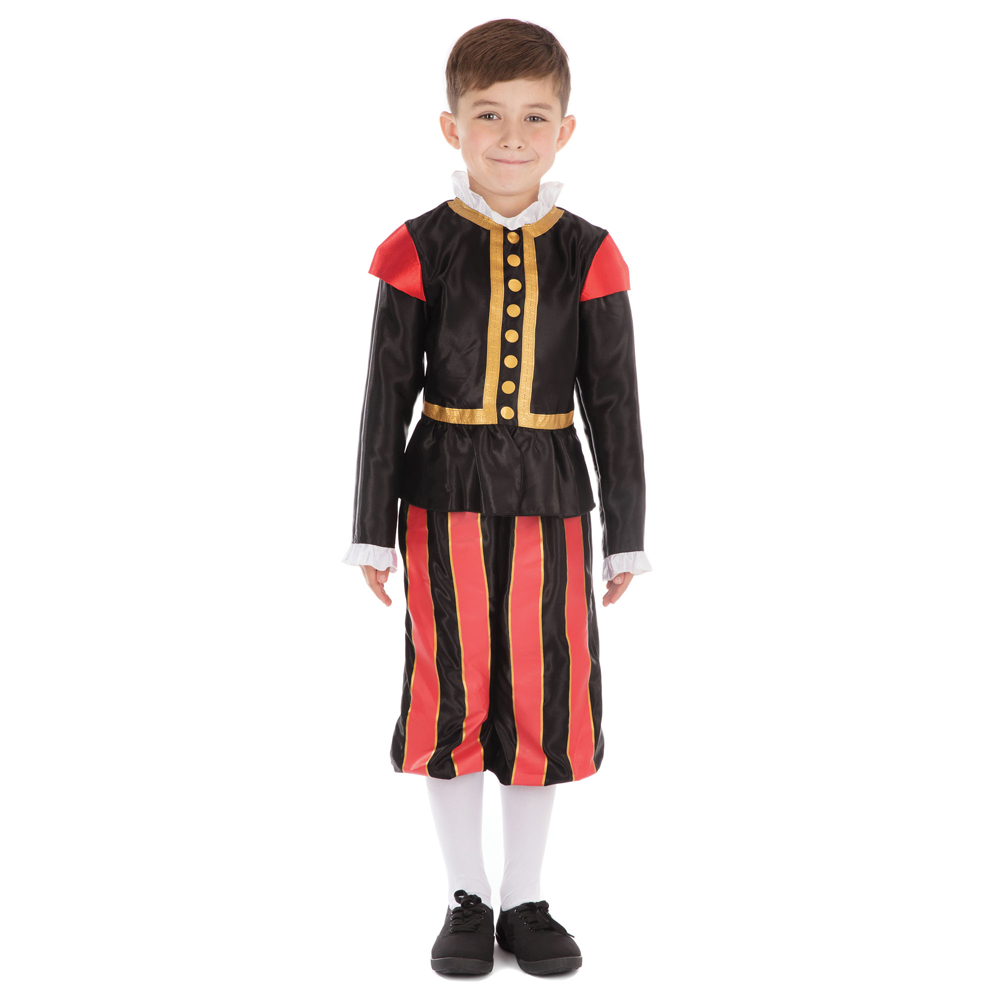 This Tween William Shakespeare Costume includes a top with printed button detail and a pair of striped trousers.