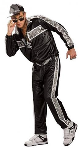 Head back to the eighties in this glitter tracksuit, ideal for any disco. Costume is a matching Jacket, trousers and cap. Light up the dance floor with its reflective mirror look and shine for all the ladies while they check out your moves.
