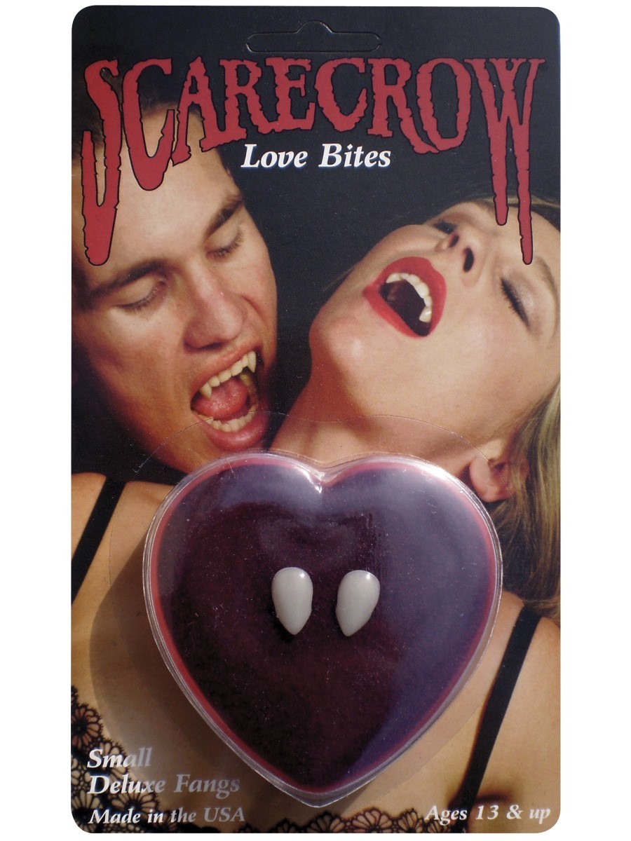 Small fangs complete with heart shaped box- Perfect for vampire costumes this Halloween.