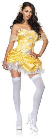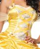 This pretty Teen Storybook Beauty costume includes a yellow ballgown style halterneck dress with rosette and ruched accents and attached gold arm drapes. The dress bodice also features ribbon lace up detailing.