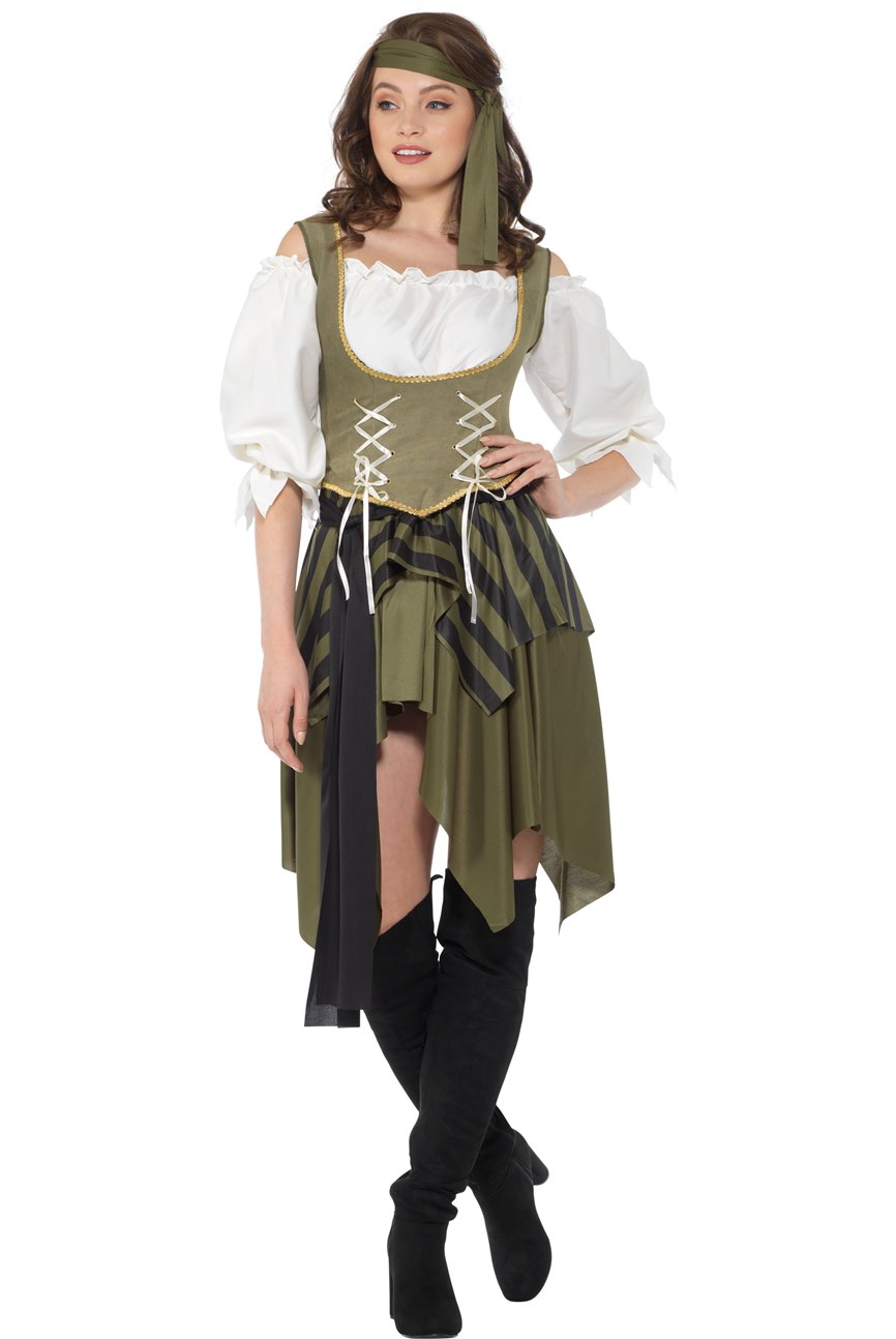 Plus Size Swashbuckler Girl Costume includes an off the shoulder blouse with an attached waistcoat. Costume also includes a skirt and a headband.