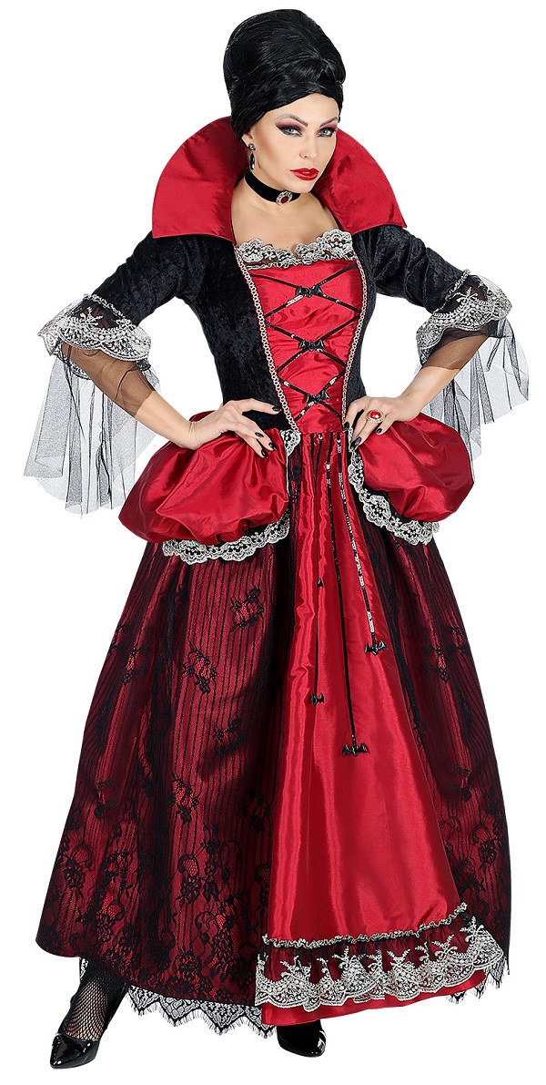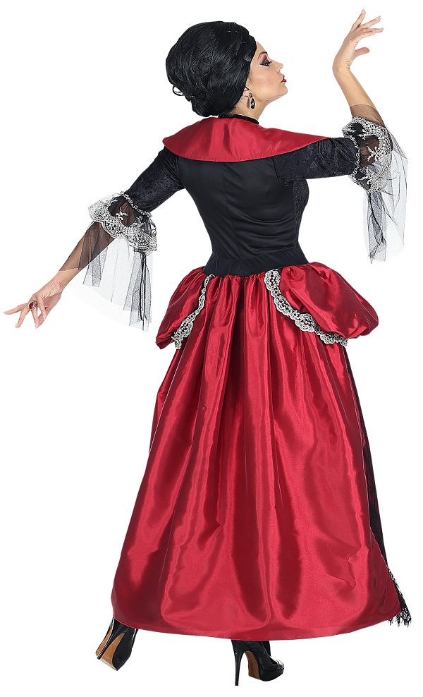 Be an elegant Vampiress this Halloween with our Vampiress Costume. Included in this costume is a long black and red dress with bat applique and silver detailing. This stunning dress features a stand up collar and a mesh overlay.