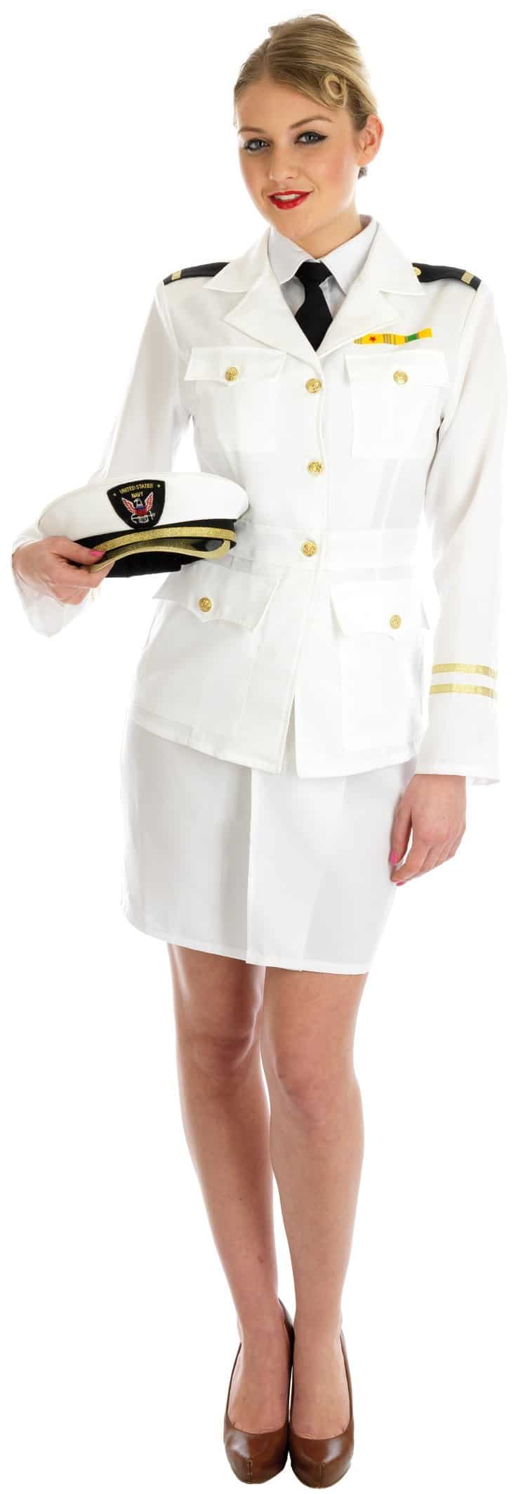1940's Lady Naval Officer includes a smart white jacket with gold buttons, crest, gold detail on the sleeves and two epaulets on each shoulder, the jacket also has an attached shirt front with a black tie. White skirt with elasticated waist and a short slit at the back and a matching hat with United States Navy badge attached.