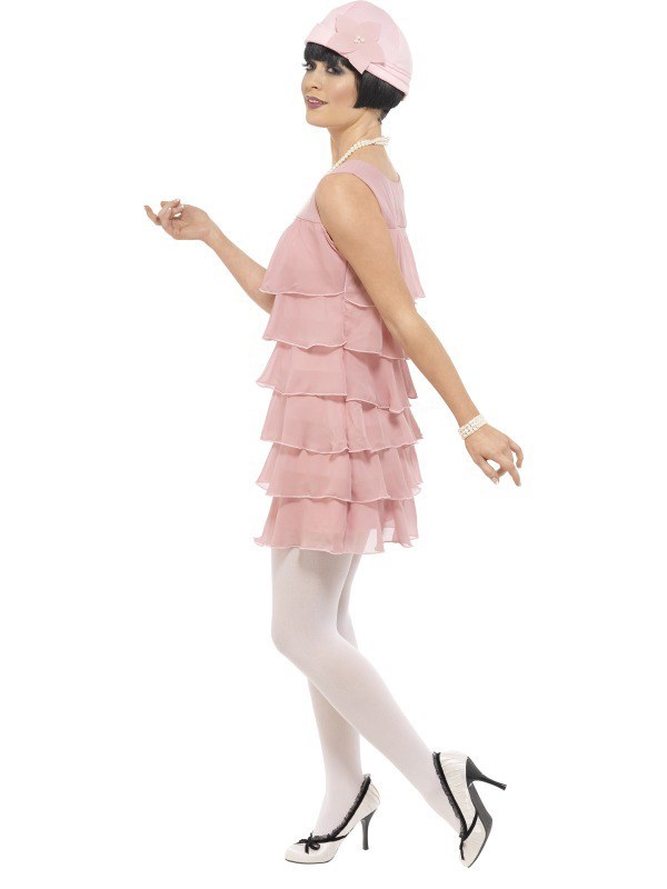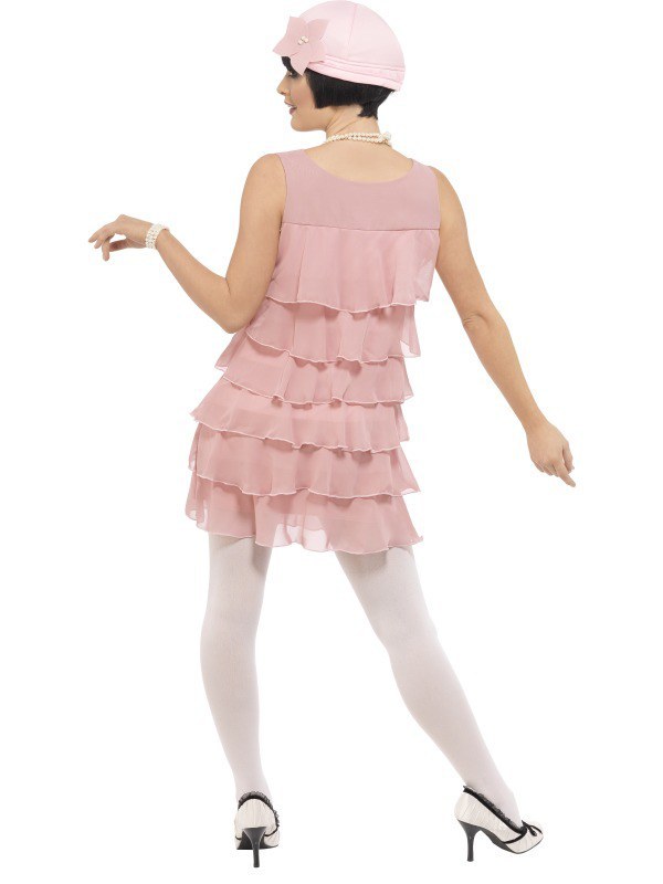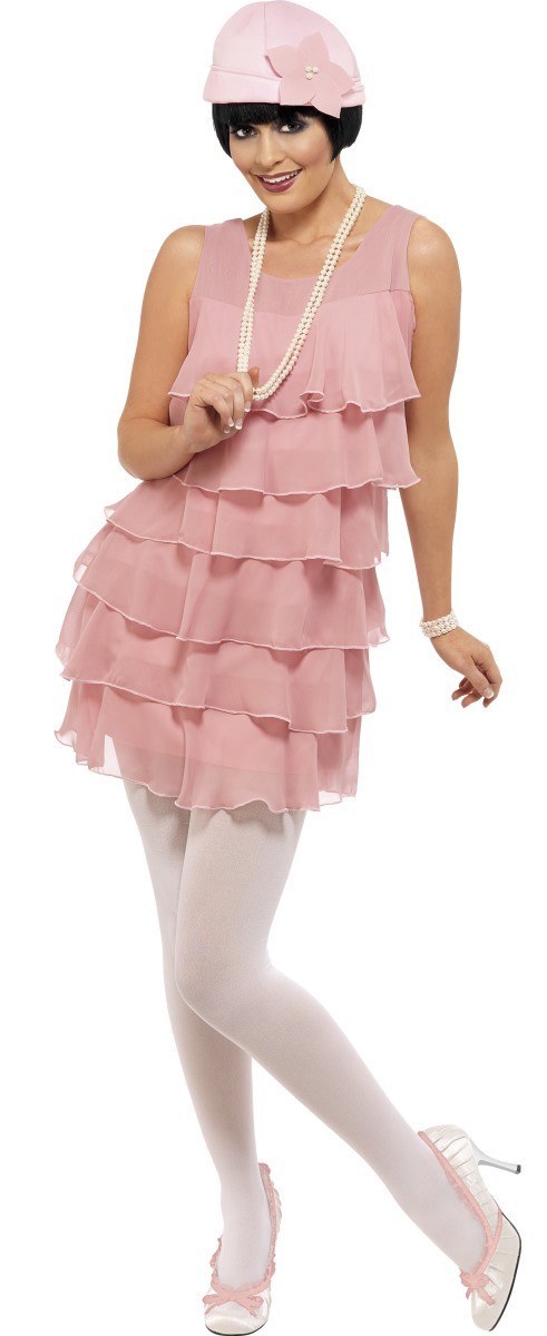 20's Cutie costume includes pink ruffled dress and matching hat with flower accent. Costume also includes a pearl necklace and pearl bracelet.