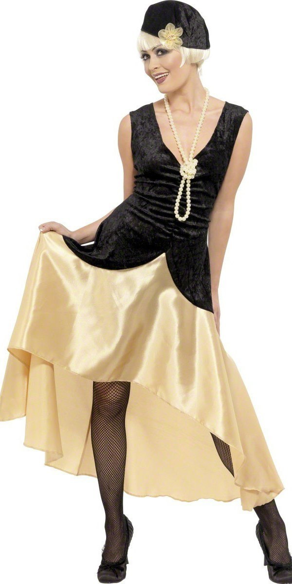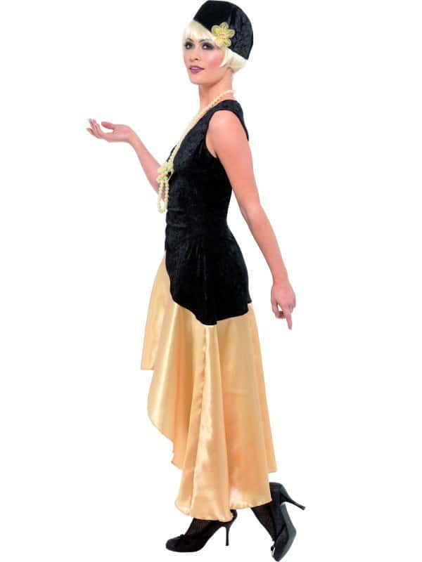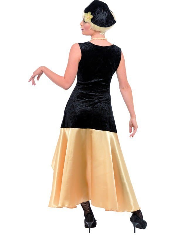 Step back to the roaring twenties with our Gatsby girl costume. It includes a black and gold dress with a velour v-neck top and a gold satin bottom. A pearl necklace and a velour hat with flower accent are also included.
