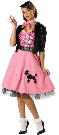 50's Bad Girl Costume includes a black patent jacket, pink dress with leopard print top and poodle detail on the skirt and attached petticoat, pink scarf and black leather look belt.