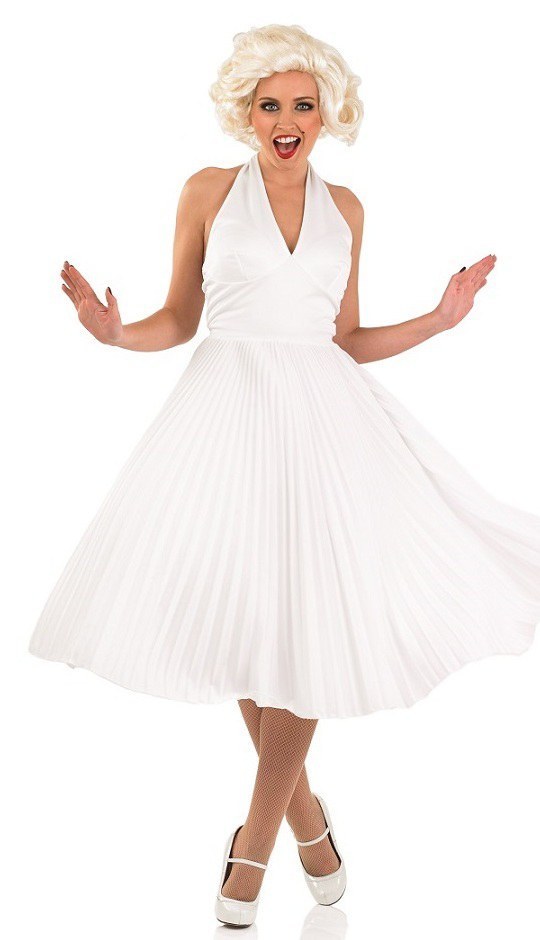 Become a very famous 50's movie star in this elegant costume. A crisp white, halterneck and knee length dress with flowing pleats and wig.