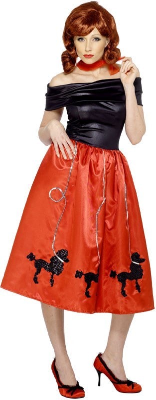 50s Poodle Dress is a fun red skirt with sequin poodle details and attached black wet look off the shoulder top. Also includes red scarf.