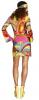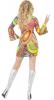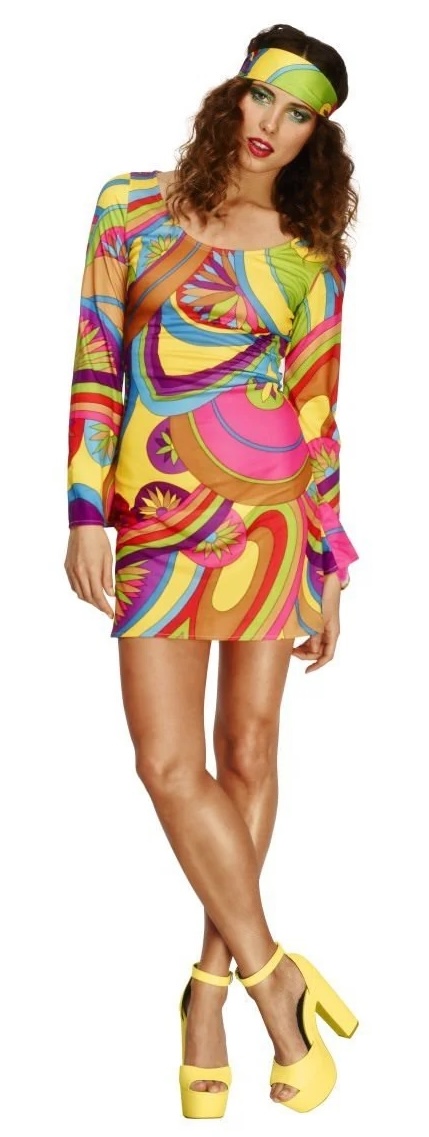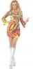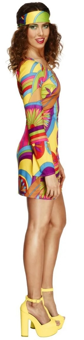 Our Flower Power 60's costume consists of a short multi coloured low neckline dress with bell bottom sleeves and a matching headband.