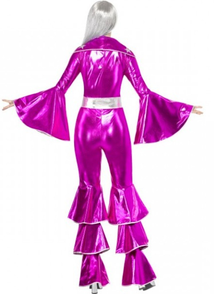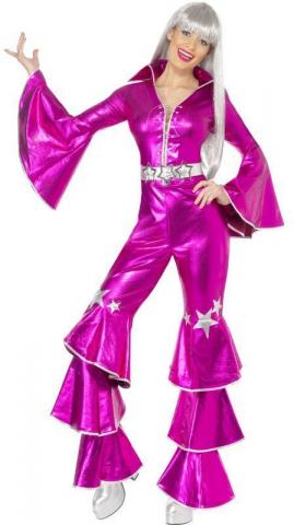 Create the 1970's disco look with this ladies Dancing Dream Jumpsuit. Costume consists of a pink shiny lycra jumpsuit with a lace up front, flared arms and flared legs. The pink jumpsuit has a silver leaf design and silver belt.