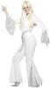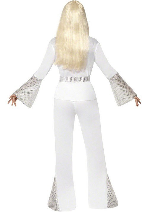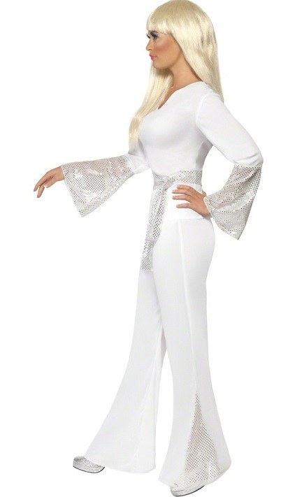 This costume includes a white top with silver sequin bell bottomed sleeves, flared trousers with elasticated waist and a sequins tie belt.