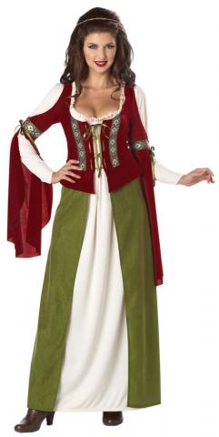 Adult Maid Marian Costume consists of a long red and green dress with bright white underlay.