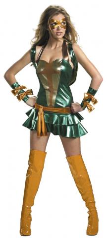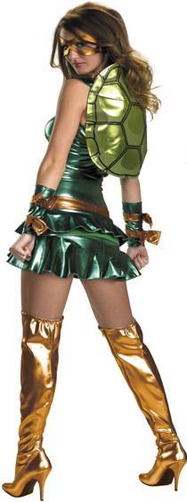 Our sassy Michelangelo costume features turtle shell mini ruffle halter dress with attached faux gold belt which sits on your waist. Also included is a gold eye mask with closure to the back for a secure fit and two green wristbands with attached gold ribbon.