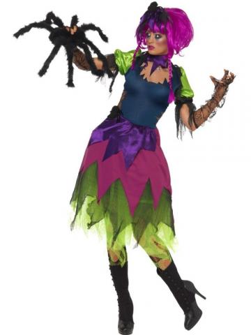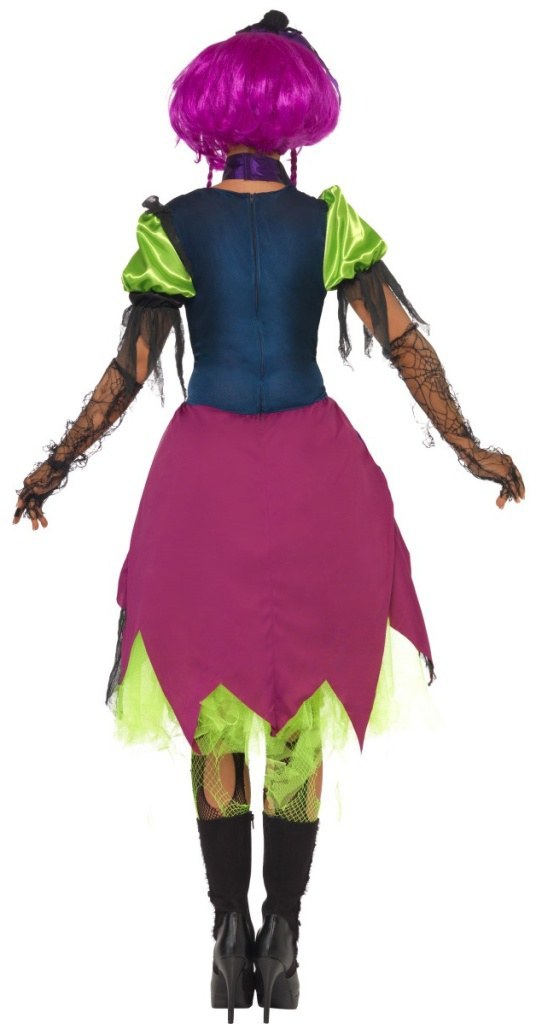 Miss Snuffed It Costume includes a layered dress with mesh and lace detailing. Also included is a purple and black headpiece with on a headband.