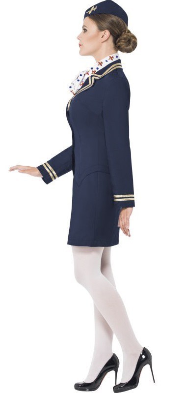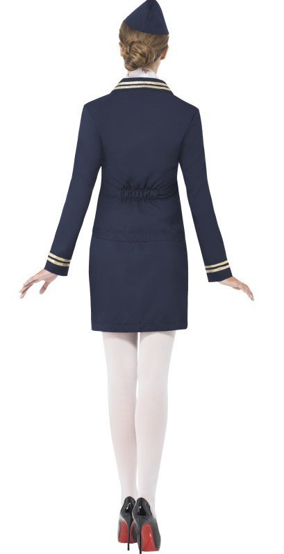 Airways Attendant Costume includes a navy jacket with gold button detailing. Costume also includes a navy skirt and a printed scarf.