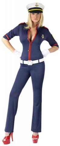 All Hands On Deck costume includes a one piece navy jumpsuit with zip up front and red trim. The jumpsuit also features shoulder applique and gold button detailing with a gold anchor badge. Also included is a white belt and a sailor hat.