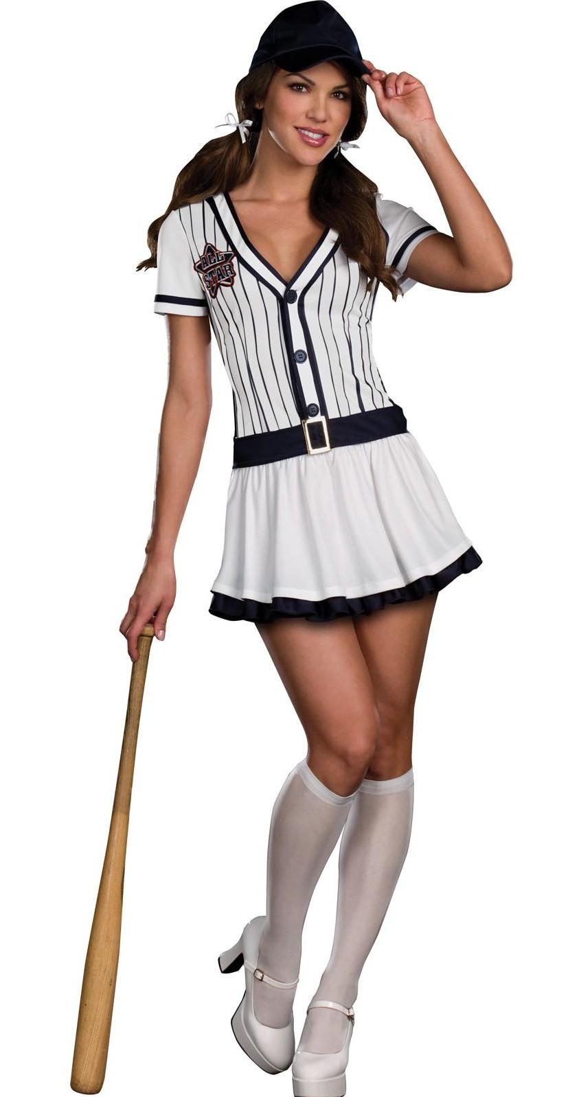 All Star Hottie Costume includes a navy and white dress with button detailing and and "All Star" badge. Also included is a navy belt with silver buckle and a navy hat.