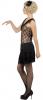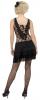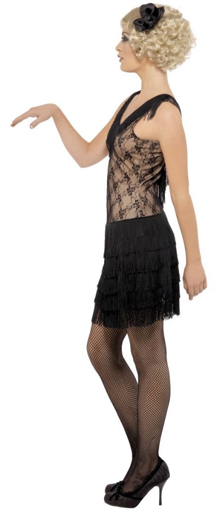 All That Jazz Costume includes a black dress with a lace top and fringe detailing on the skirt and along the neckline. The back of the dress features lace up detailing.