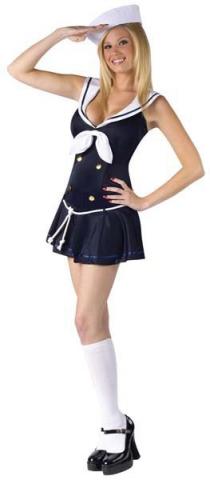 Sail the high seas with our Anchors Away costume. This cute costume consists of a short navy sailor dress with white bow, gold button detailing and a halter collar. Also included is a white rope belt.