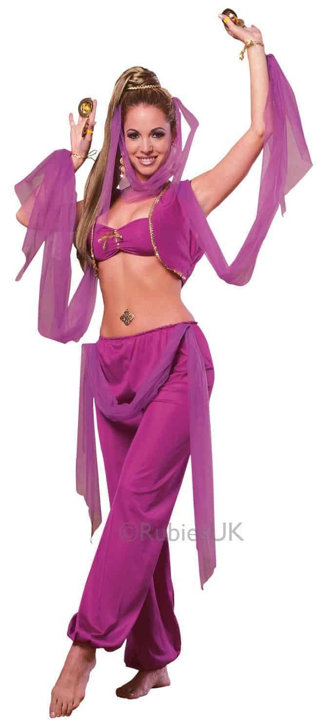 Arabian Seductress Costume consists of a halter bikini top with attached sleeves, headpiece and trousers.