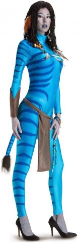 The Neytiri costume includes a blue coloured full bodysuit with an attached tail. Also comes with a brown fabric arm gauntlet with snakeskin pattern. There is a brown fabric apron to tie around the waist.
