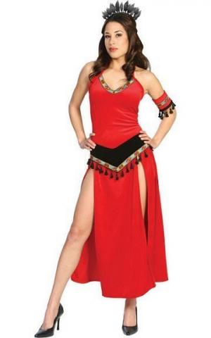 Aztec Maiden Ladies Fancy Dress. This excellent quality full length red dress with a v-neck design and halter neck also features a faux suede belt with black tassels and the belt adjusts for your convenience. The skirt of the dress has large splits up the front of the skirt. The Aztec Maiden costume is completed with matching arm band and feather like headpiece.