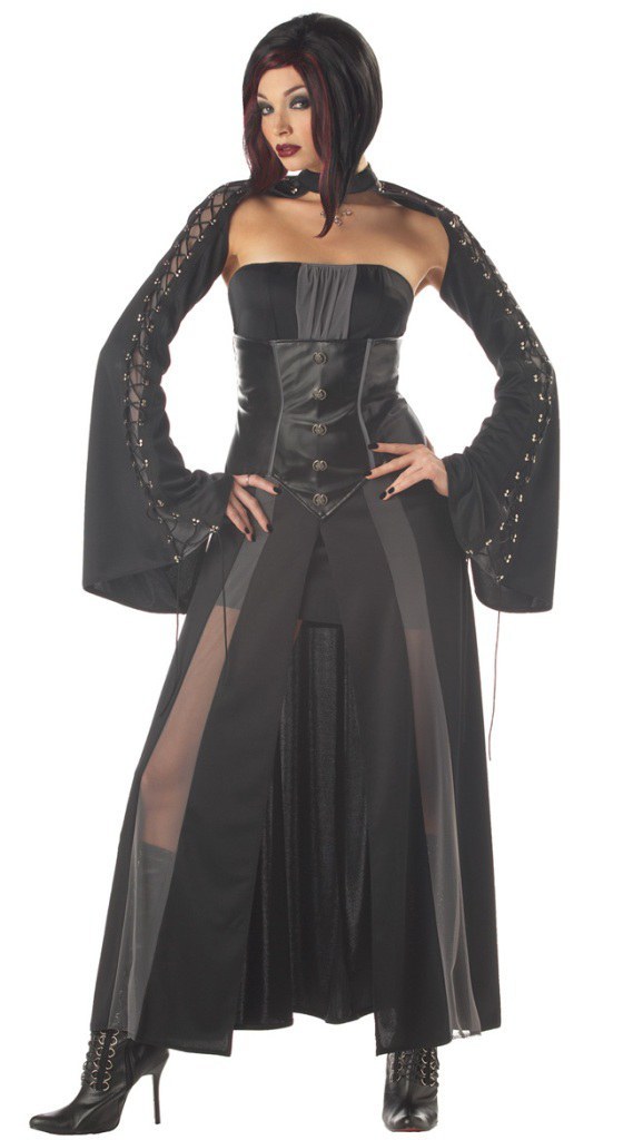 The costume consists of a strapless dress in black with a corset effect to the front. The skirt of the dress comes with an open front and sexy mesh detailing on the sides.