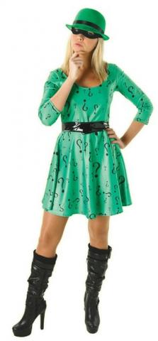 From the hit Batman trilogy comes out female Riddler costume. Costume includes a green dress with black printed question marks and a black latex belt. Also included is a matching green hat and eye mask.