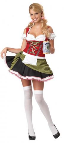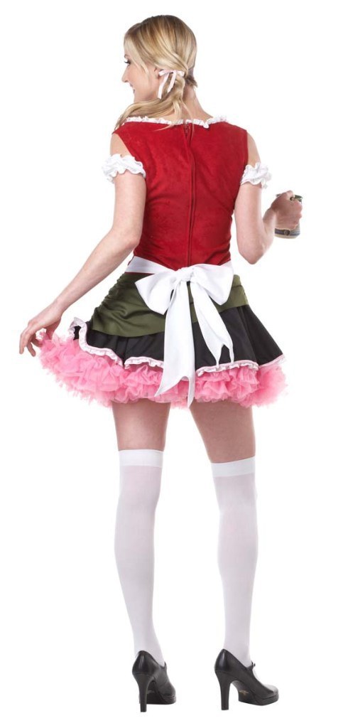 Pretty Bavarian Bar Maid features a beautiful short dress with silver filigree buttons that give the corset effect.