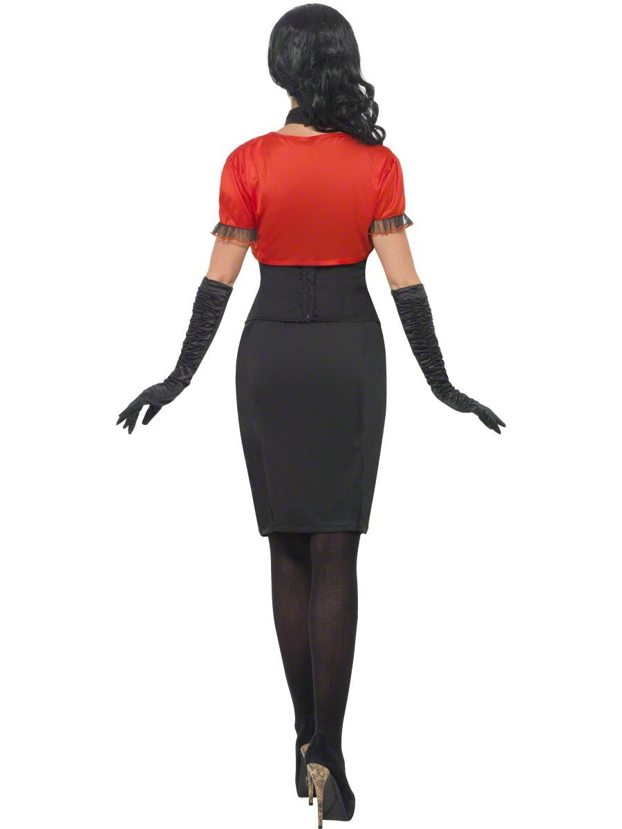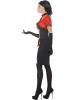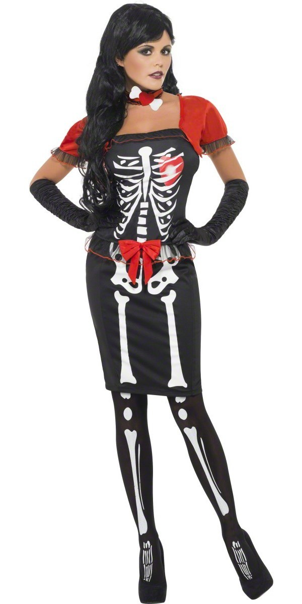 The Beautiful Bones Costume features a black pencil skirt with bone print on the front and a matching black corset top with bone print and red bow and heart detail and net hem. To complete the look a matching red short sleeve bolero with mesh detailing on the sleeves and choker with bone and heart detail are also included.