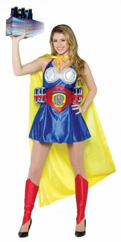 Costume also includes a red belt with 'Beer Girl' printed writing and has a Velcro fastening with six slots for beer bottles or cans. For that true superhero look costume includes a long yellow cape ties around the neck.