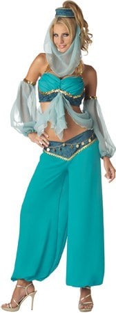 Harem's Jewel Costume consists of Sequin-trimmed halter bra top with attached chiffon drape, coin-trimmed pants with built-in panties, sequin-trimmed chiffon sleevelettes and headpiece with attached veil.