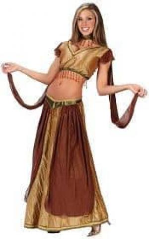 The Belly Dancer Costume includes gold V neck belly top with beads, long gold and burgundy skirt with dark green waist and beaded neck piece.