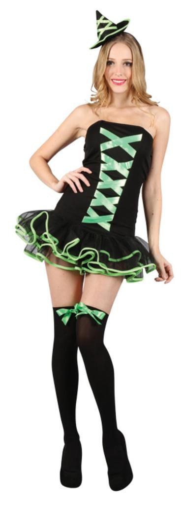 Bewitched Babe costume includes a short black tutu style dress with green trim and green lace up front. Also included is a matching hat and gartes with bows.