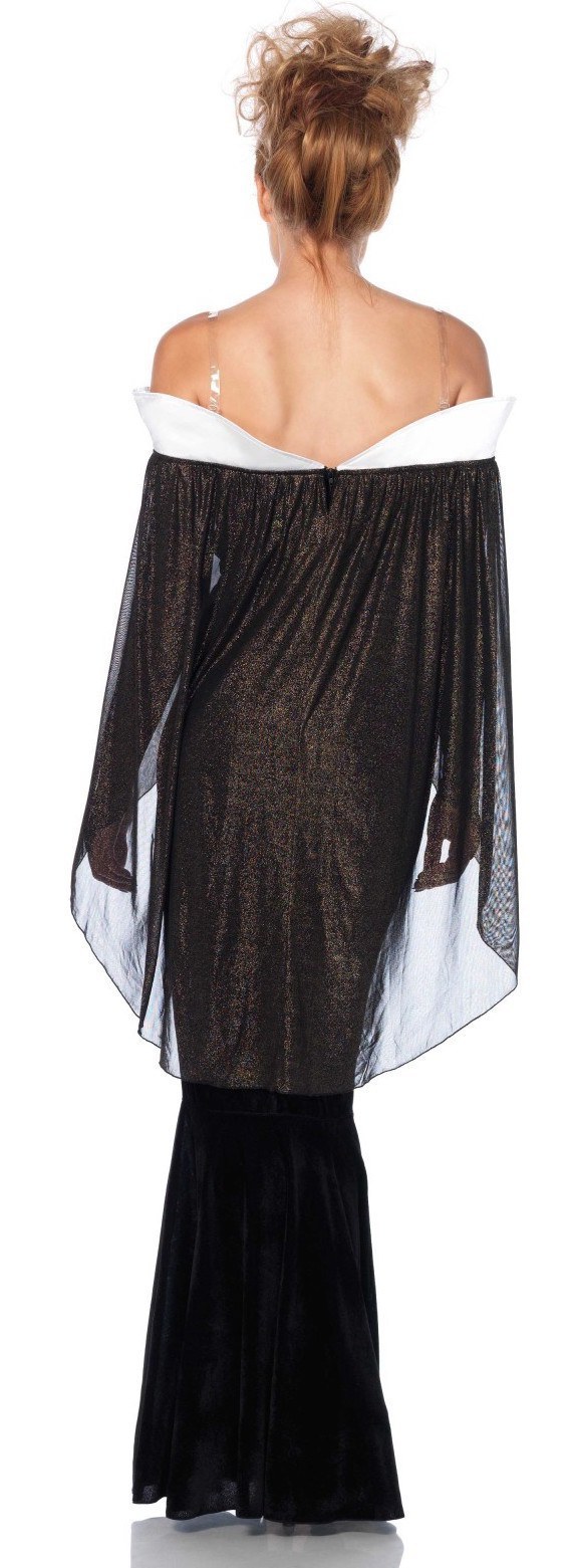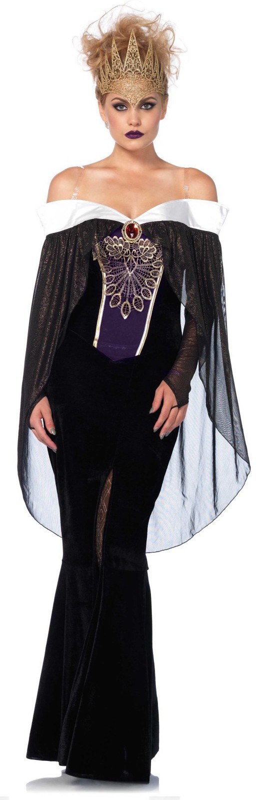 Bewitching Evil Queen Costume includes a long off the shoulder velour dress with lace applique bodice and a glitter sheer capelet. The dress also features attached clear straps.