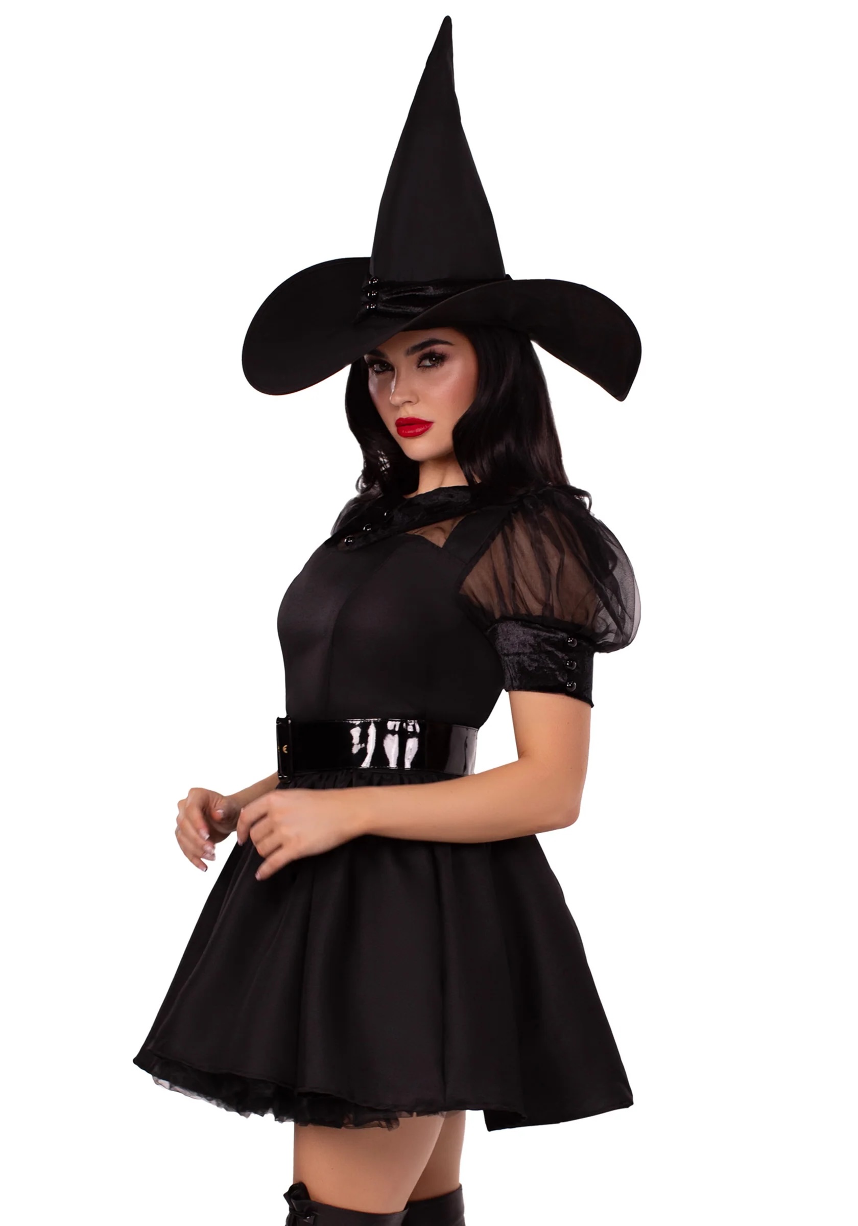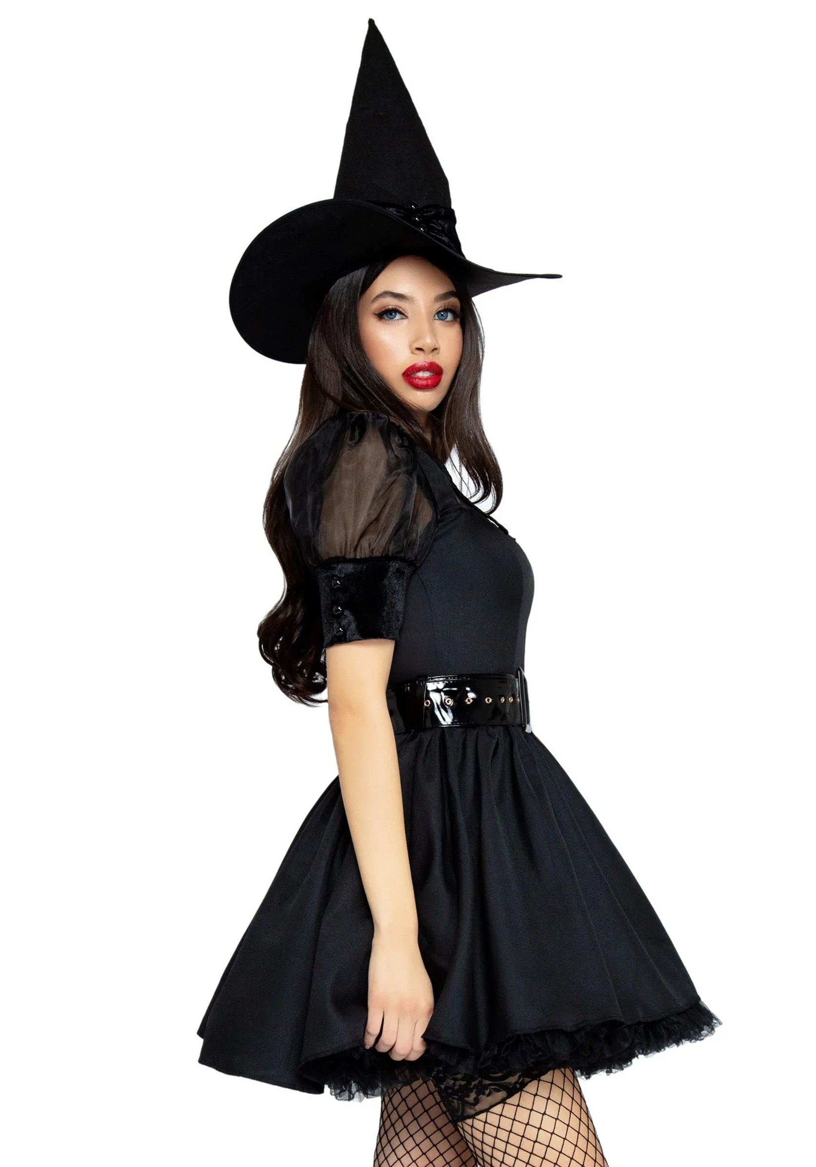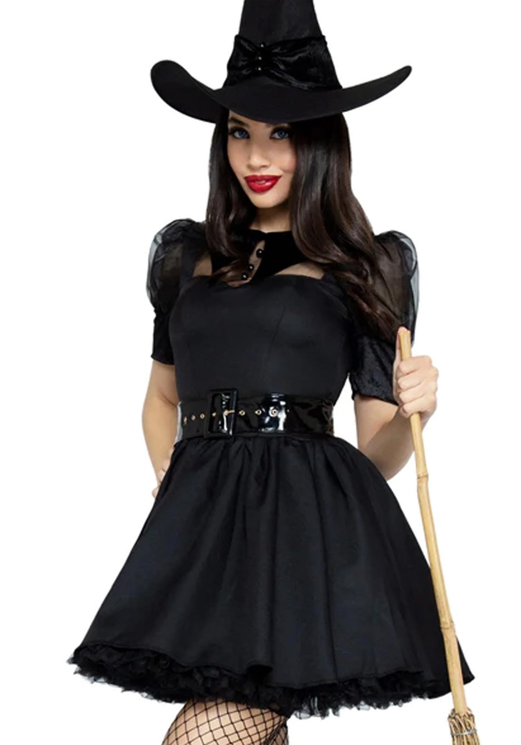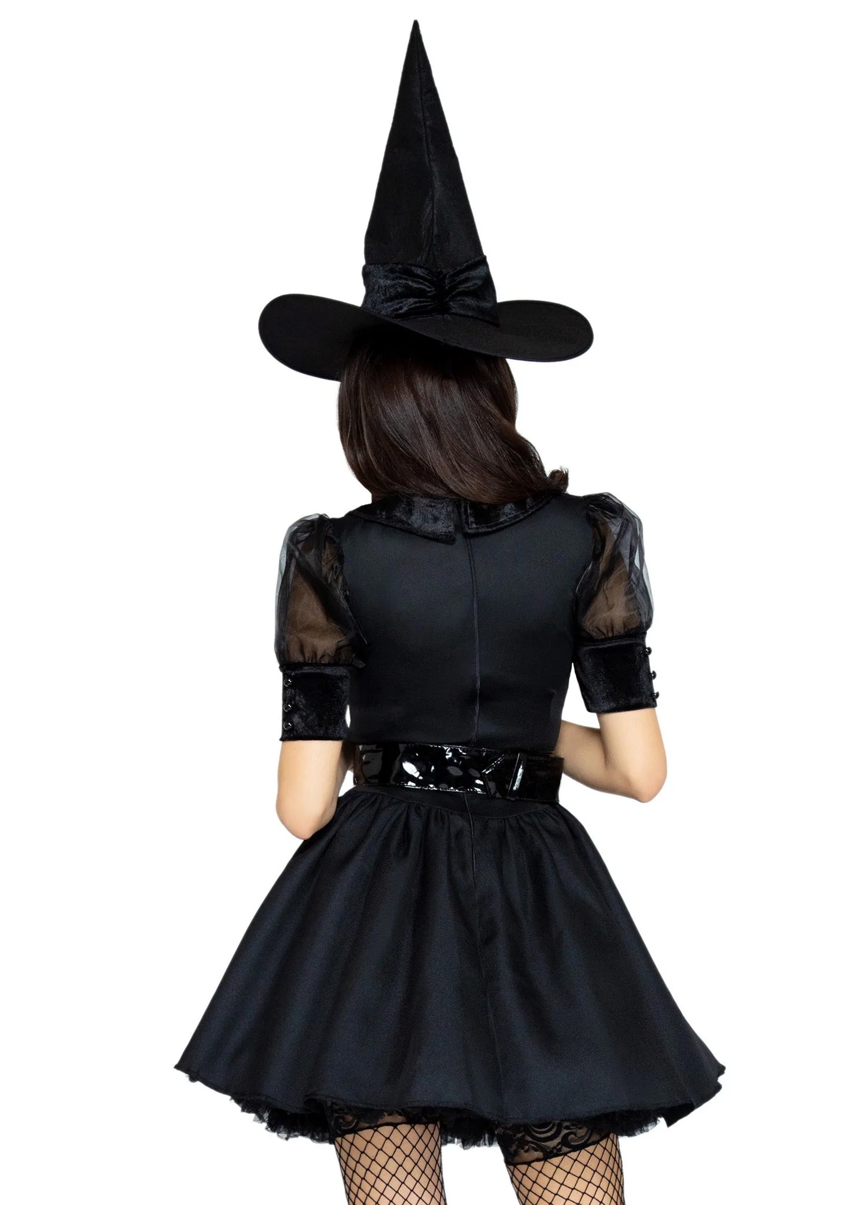 This deluxe quality Bewitching Witch costume includes vintage inspired dress with organza and velvet collared bodice. To complete the look a wide belt and matching hat