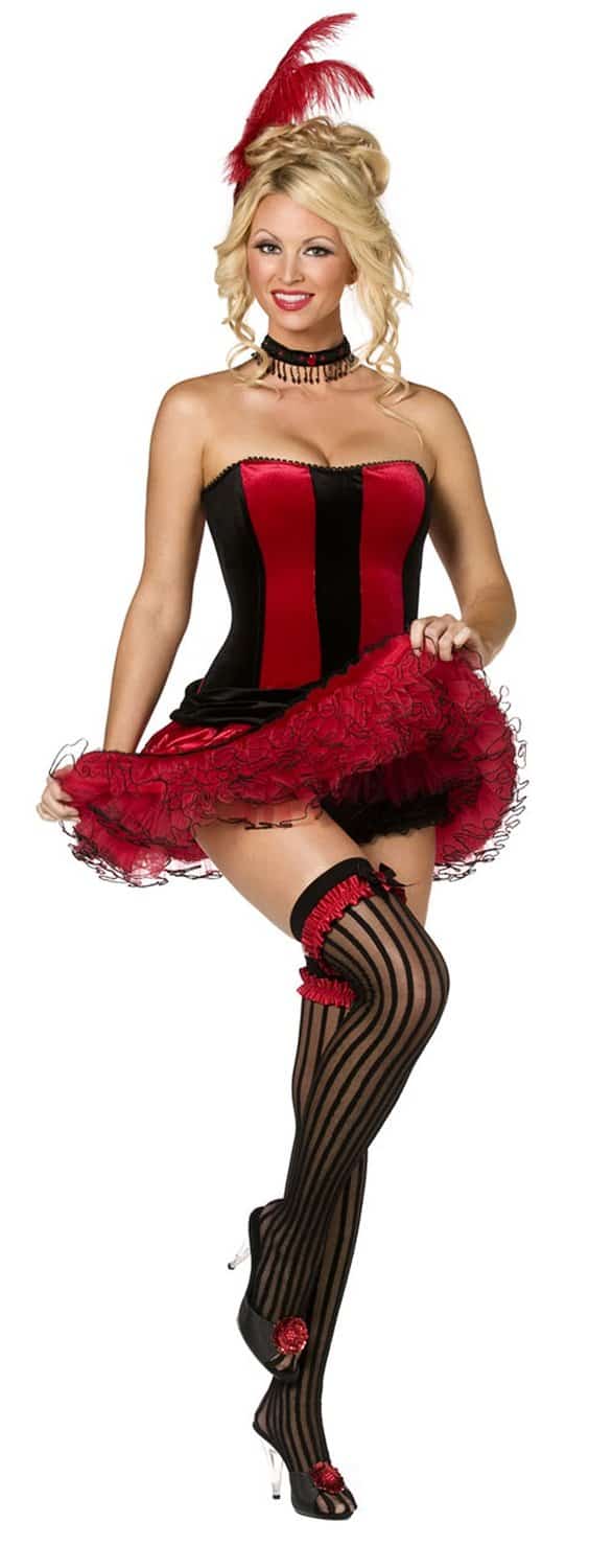 Bijou boutique can-can sweetie consists of a red and black striped velvet feel corset, a ruffled tutu, red feather hair clip and a choker.