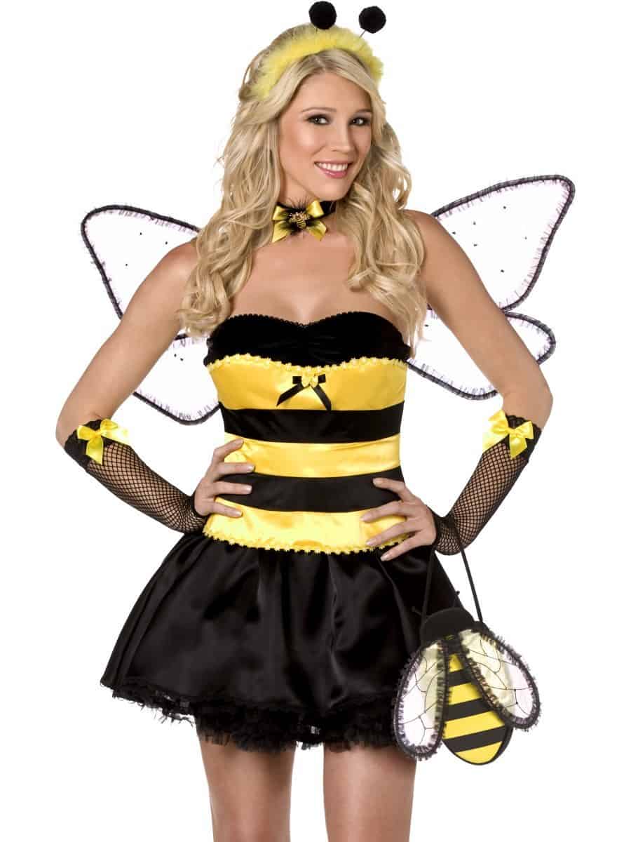 Bijou Boutique Honey Bee Ensemble consists of 7 pieces: A black mini dress, yellow and black striped corset, wings, net glovettes & knee highs. It also includes bee headband and a matching choker to complete this buzzing look.