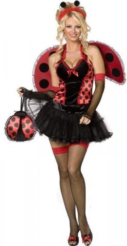 This stylish Lady Bug Ensemble comprises of 7 pieces: Black and Red Halter Top, tutu, fishnet stockings with red lace trim, matching glovettes, polka dot bloomers, Ladybug wings and headband.
