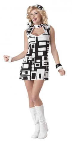 This Groovy Chick costume is ideal for any swinging 60's theme party. Costume consists of a black and white block, sleeveless mini dress with a high neck which features a single button closure.