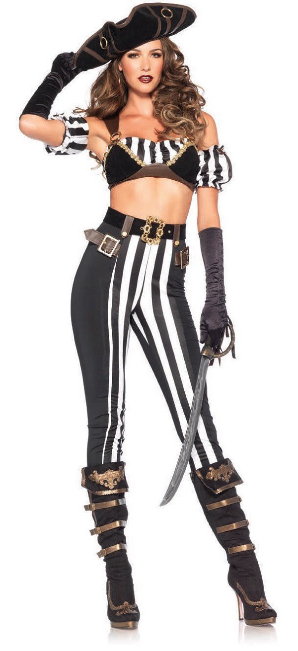 Black Beauty Pirate costume includes a bra top and matching arm puffs. Costume also includes a pair of black and white striped trousers.