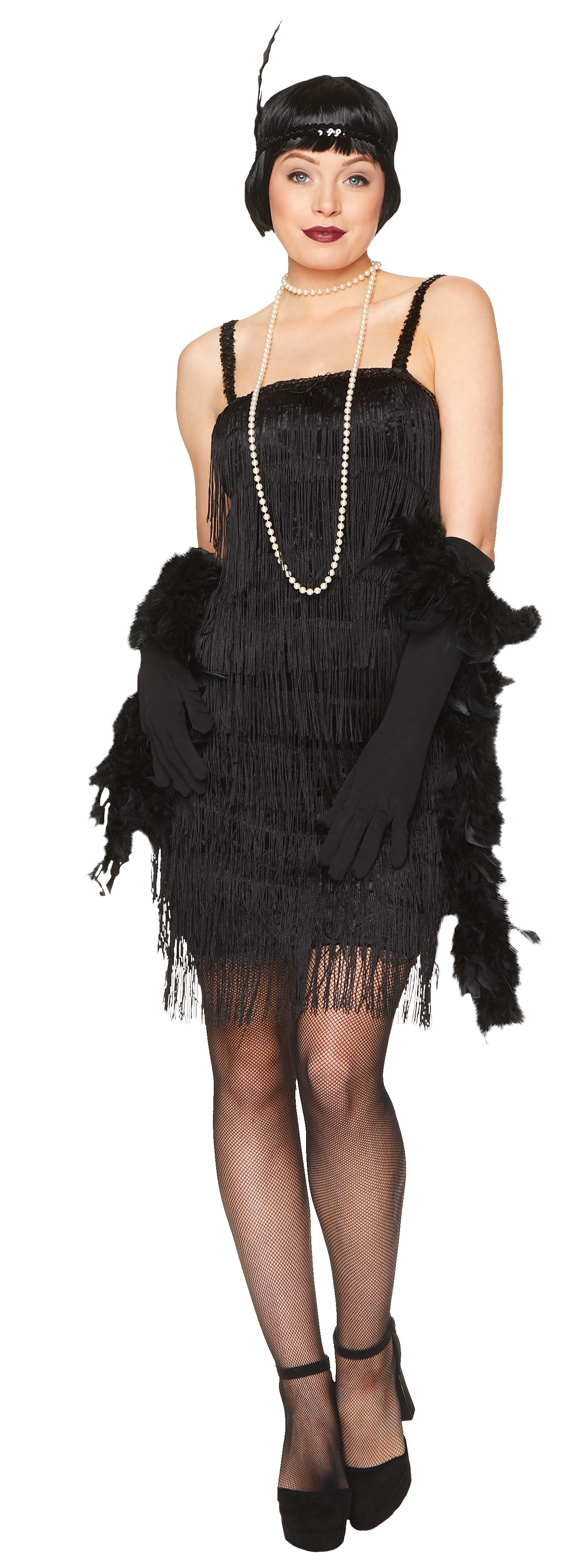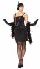 Flapper Girl costume includes a black fringed dress with sequin straps and a pair of black gloves. Costume also includes a black sequin headband with a feather.