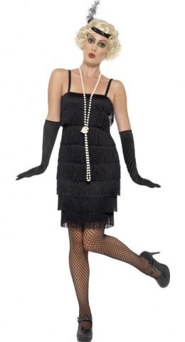 Black Flapper costume includes a black fringed dress and a pair of long black gloves. To complete the look a sequin headband with black feather is also included.