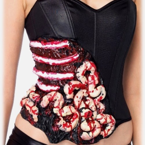 The perfect addition to create a truly gruesome Halloween costume. Complete with exposed rib cage, and bloody intestines.
