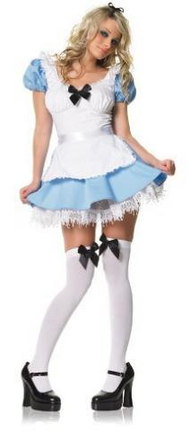 Alice in Wonderland two piece costume consists of light blue short puff sleeve dress with attached white apron that also features a black bow.