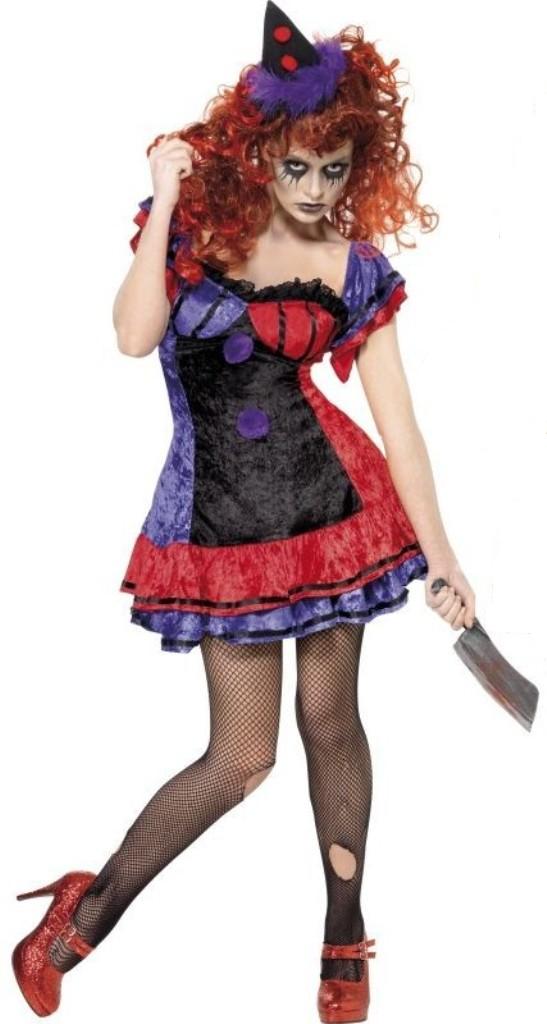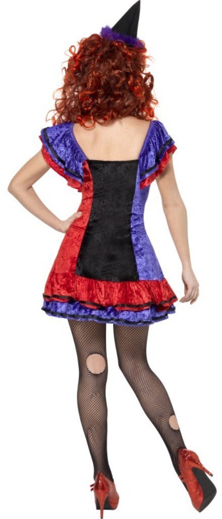 Join the circus freaks with our Bo Bo the clown costume. It includes a cute velour dress with bobbles at the front and lace detailing at the bust line. The sleeves are ruffled and also the bottom of the dress have ruffled layering. There is a white petticoat also attached to create fullness to the dress.