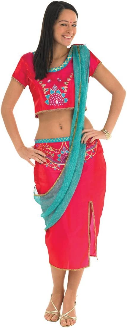 Stand out in our traditional Bollywood Starlet Costume, the costume includes a cerise pink belly top with turquoise and gold detail with pink jewels with gold embroidered trim. This costume also includes a coordinating skirt