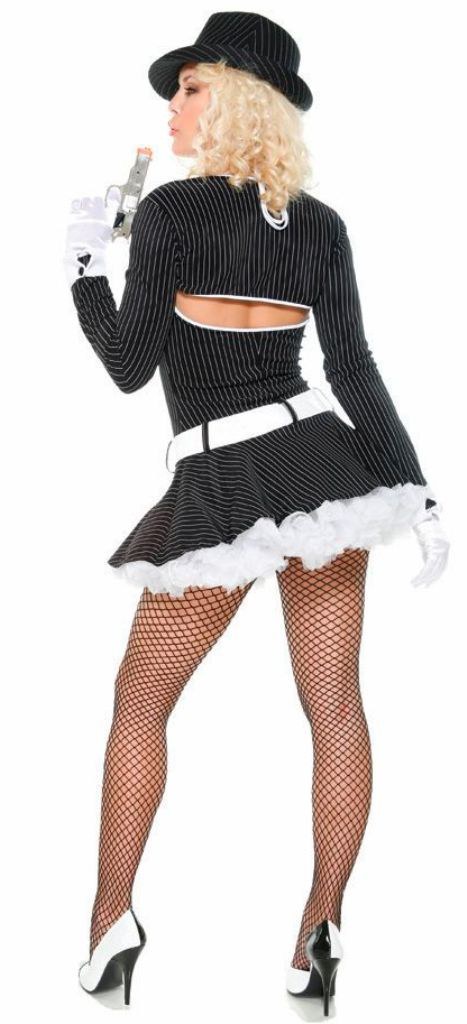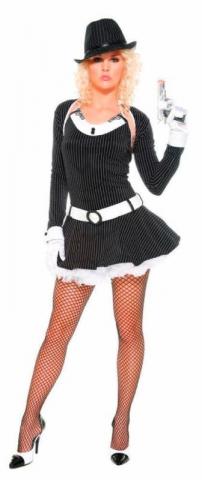 Bombshell Bugsy costume includes a black and white pin striped mini halter dress with matching bolero. Also included in this gangster costume is a white belt and a pair of white gloves with button detailing. To complete the look a gun is also included.